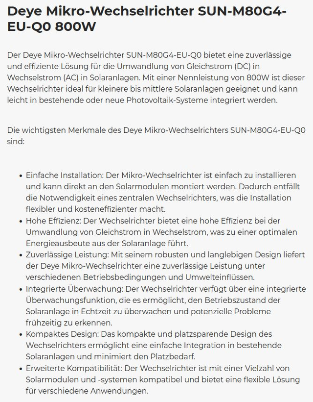 Der Deye Mikro-Wechselrichter SUN-M80G4-EU-Q0 800W ist die ideale Wahl für Hausbesitzer, Unternehmen und Installateure, die eine zuverlässige und effiziente Lösung für ihre Solaranlagen suchen. Mit seiner einfachen Installation, hohen Effizienz und zuverlässigen Leistung bietet dieser Wechselrichter eine ausgezeichnete Möglichkeit, saubere und erneuerbare Energie aus Sonnenlicht zu gewinnen.