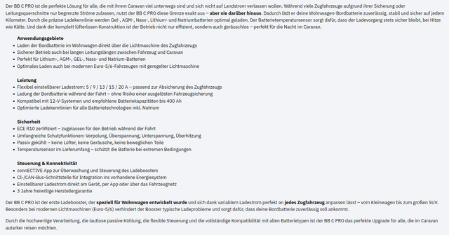 Der BB C PRO arbeitet komplett geräuschlos dank passiver Kühlung und ist mit allen gängigen Batterietechnologien kompatibel – inklusive moderner Natriumbatterien. Du steuerst ihn ganz einfach direkt am Gerät, über die connECTIVE App oder via CI-/CAN-Bus. Dank ECE-R10-Zertifizierung ist der Betrieb während der Fahrt absolut sicher.