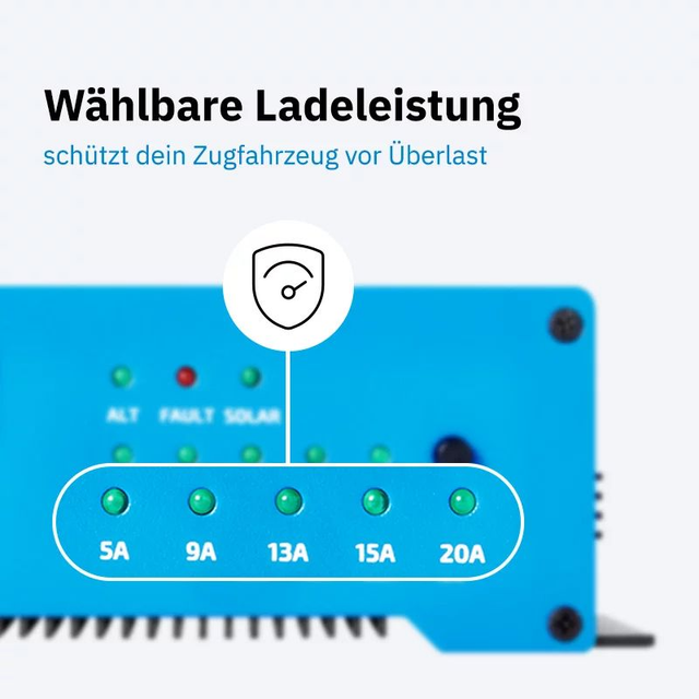 Der ECTIVE BB C PRO wurde speziell für Wohnwagen und Caravans entwickelt und ermöglicht eine flexible Anpassung des Ladestroms an die Absicherung deines Zugfahrzeugs. Egal ob 5, 9, 13, 15 oder 20 Ampere – du bestimmst, wie viel Strom über die Anhängerkupplung fließen darf. So wird deine Bordbatterie während der Fahrt optimal geladen, ohne jemals die Sicherung deines Fahrzeugs zu überlasten.