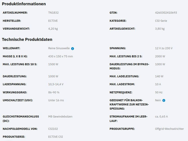 ECTIVE CSI 10 1000W/12V Sinus-Wechselrichter mit Ladegerät, NVS- und USV-Funktion