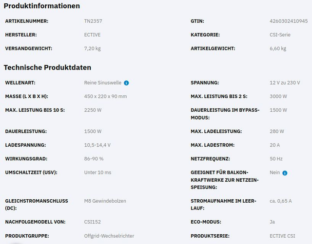 ECTIVE CSI 15 1500W/12V Sinus-Wechselrichter mit Ladegerät, NVS- und USV-Funktion