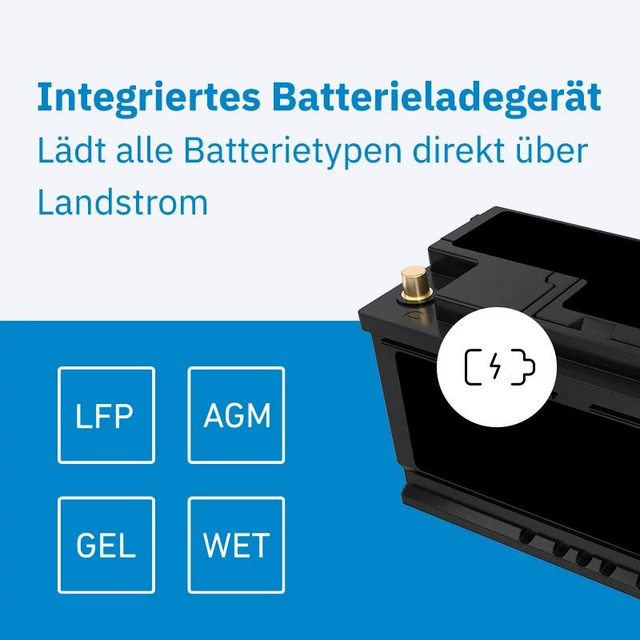• Integriertes Ladegerät – lädt jede gängige Batterietechnologie bei Netzanschluss