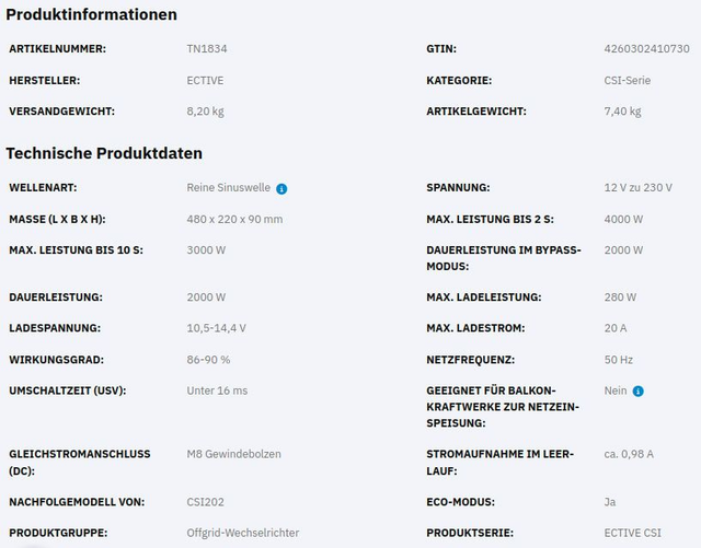 ECTIVE CSI 20 2000W/12V Sinus-Wechselrichter mit Ladegerät, NVS- und USV-Funktion