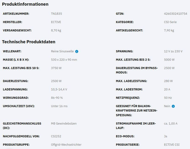 ECTIVE CSI 25 2500W/12V Sinus-Wechselrichter mit Ladegerät, NVS- und USV-Funktion