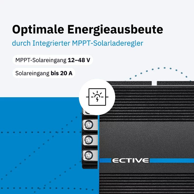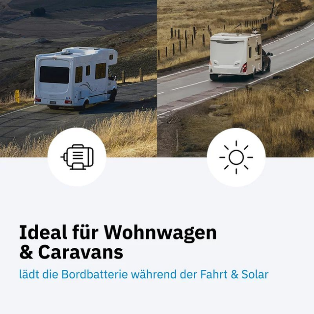 Der ECTIVE SBB C PRO wurde speziell für Wohnwagen und Caravans entwickelt und lädt deine Bordbatterie sowohl über die Lichtmaschine des Zugfahrzeugs als auch über die Sonne durch einen integrierten MPPT Solarladeregler. Dank einstellbarem Ladestrom, integriertem MPPT-Laderegler und komplett geräuschlosem Betrieb macht er deinen Caravan jederzeit autark – ganz ohne Eingriffe ins Zugfahrzeug.