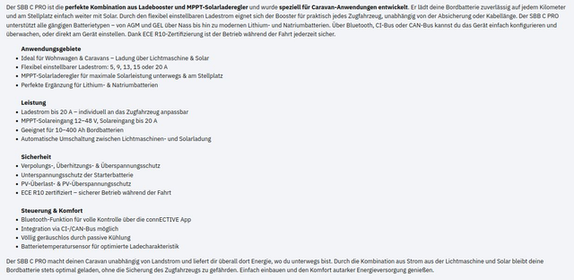 Zusätzlich verarbeitet der integrierte MPPT-Solarladeregler effizient Solarenergie und sorgt selbst bei diffusem Licht für maximale Ausbeute. Der Ladebooster arbeitet vollständig passiv gekühlt und damit absolut geräuschlos, ideal für ruhige Nächte im Wohnwagen.