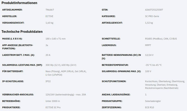 Maximale Solarmodulleistung von 300 / 600 Wp bei 12 / 24 V