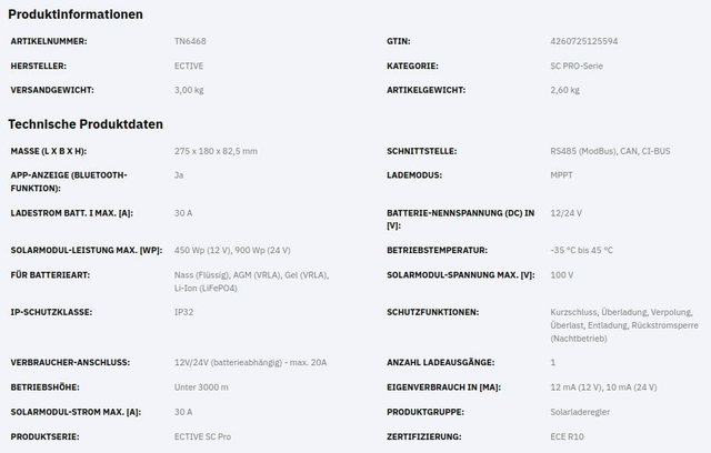 Maximale Solarmodulleistung von 450 / 900 Wp bei 12 / 24 V