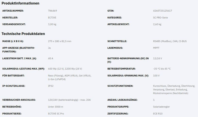 Maximale Solarmodulleistung von 600 / 1200 Wp bei 12 / 24 V