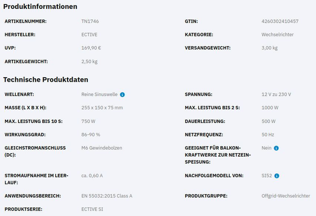 ECTIVE SI 5 500W/12V Sinus-Wechselrichter mit reiner Sinuswelle