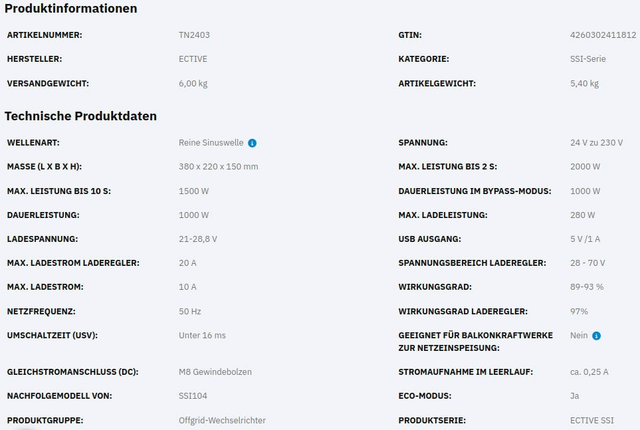 ECTIVE SSI 10 1000W/24V Sinus-Wechselrichter mit MPPT-Laderegler, Ladegerät, NVS- und USV-Funktion