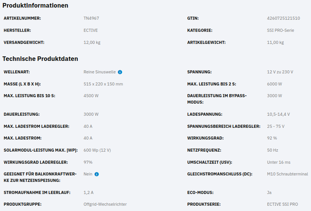 ECTIVE SSI 30 PRO 3000W/12V Sinus-Wechselrichter mit Netzvorrangschaltung, Ladegerät und Laderegler