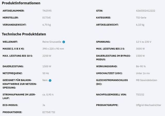 ECTIVE TSI 15 1500W/12V Sinus-Wechselrichter mit NVS- und USV-Funktion