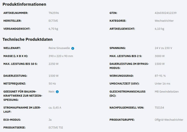 ECTIVE TSI 15 1500W/24V Sinus-Wechselrichter mit NVS- und USV-Funktion
