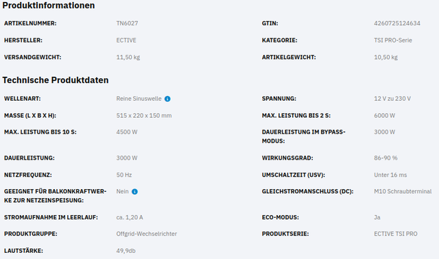 • Bis zu 6000 W Spitzenleistung für kurzzeitige Lastspitzen