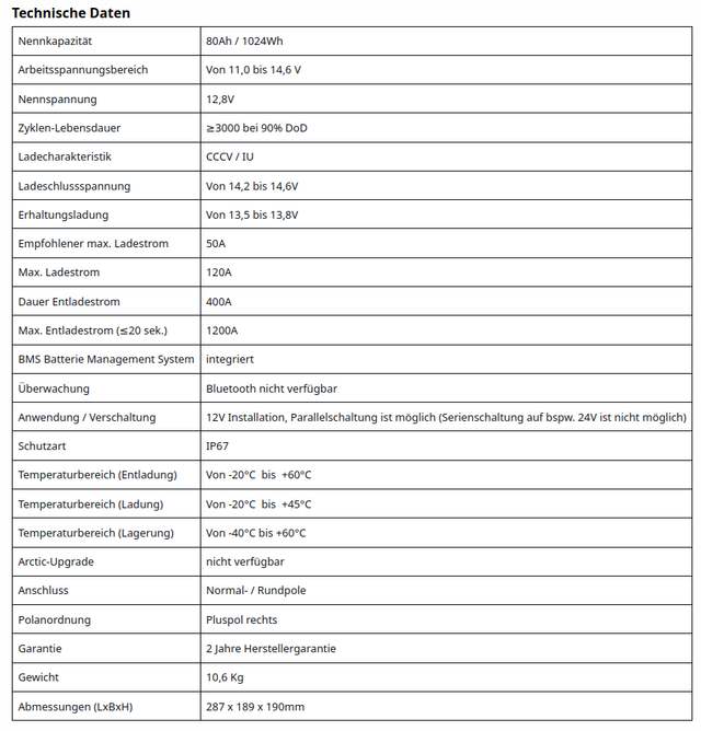 • Sicherste Lithium-Technik (LiFePO4): Lithium-Eisenphosphat. Kein Gasen, keine Explosions- oder Brandgefahr. Absolut wartungsfrei.