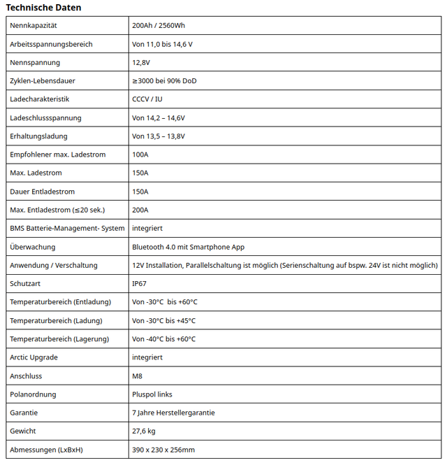 • Sicherste Lithium-Technik (LiFePO4): Lithium-Eisenphosphat. Kein Gasen, keine Explosions- oder Brandgefahr. Absolut wartungsfrei.