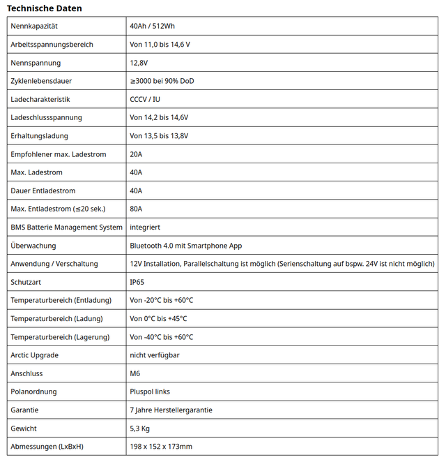 • Sicherste Lithium-Technik (LiFePO4): Lithium-Eisenphosphat. Kein Gasen, keine Explosions- oder Brandgefahr. Absolut wartungsfrei.