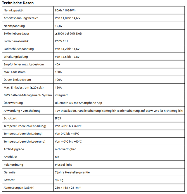 • Sicherste Lithium-Technik (LiFePO4): Lithium-Eisenphosphat. Kein Gasen, keine Explosions- oder Brandgefahr. Absolut wartungsfrei.