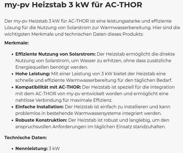 Der my-pv Heizstab 3 kW für AC-THOR bietet eine zuverlässige und effiziente Möglichkeit, Solarstrom für die Warmwasserbereitung zu nutzen. Mit seiner hohen Leistung und einfachen Integration ist er die ideale Ergänzung für Ihre Solaranlage.